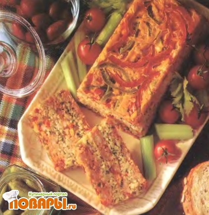 Положить форму с пирогом в глубокий противень и наполнить его горячей водой так, чтобы вода доходила до середины стенки формы. Выпекать пирог в центре духовки 1 1/2 часа, пока он не пропечется внутри. Удалить излишки жира. Остудить пирог в форме, затем поместить в холодильник на ночь. Подавать на стол с помидорами, сельдереем, маринованными огурчиками и хрустящим хлебом.