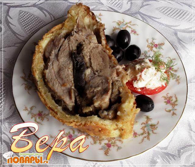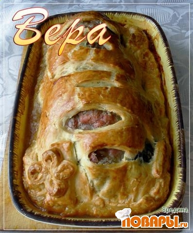 На дно формы(смазанной) выложить пласт теста, на него выложить шейку.