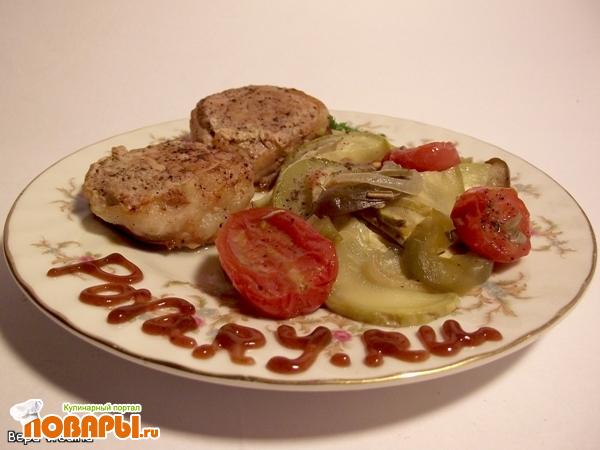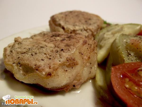 Мясо нарезать на медальоны толщиной 2 см. Сбрызнуть винным уксусом, посолить, поперчить.Каждый кусочек обернуть ломтиком бекона, закрепить зубочисткой.Обжарить медальоны на оливковом масле, по паре минут с каждой стороны.