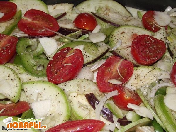 Овощи вымыть, лук, чеснок и перец очистить. Цуккини и баклажан разрезать пополам, нарезать тонкими ломтиками.