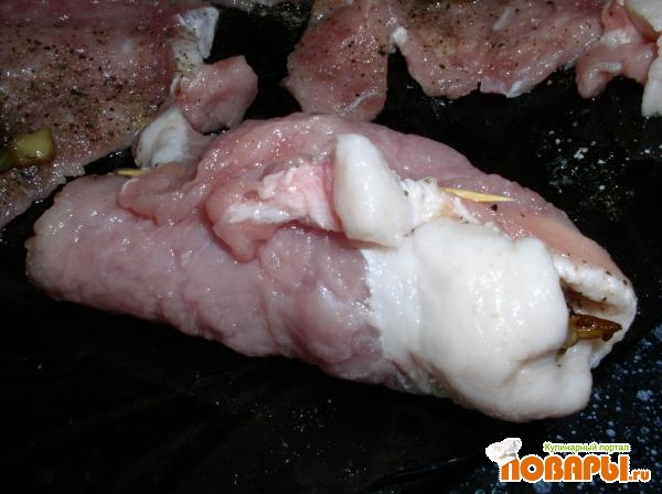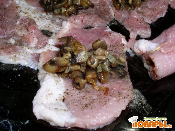 Отбивную нарезать на порционные кусочки, отбить, посолить, поперчить.
