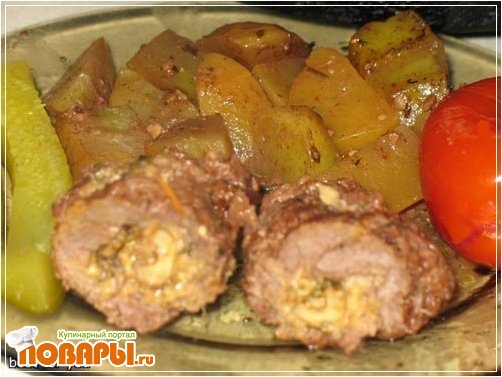 Сковороду с мясом аккуратно достань из духовки (если они потушились в ней не менее 20 минут), рулетики переверни двумя вилками, а овощи и зелень разложи между мясом, не пугаясь того, что что-то между мясом не поместится.