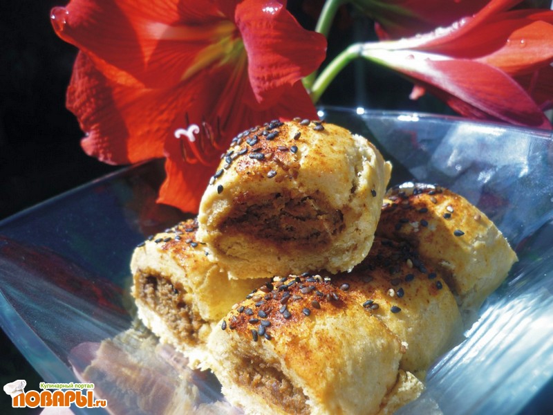 По всей длинне выложить начинку колбаской и свернуть трубочкой. Положить на смазанный маслом протвень, на каждой трубочке сделать сверху надрезы так что бы получилось 8 кусочков из каждой трубочки. Смазать белком, посыпать кунжутом и паприкой. Выпекать минут 20 при 180ºС.