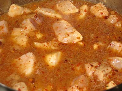 Выложить мясо к луку, добавить паприку, соевый соус, уксус, воду (отлить немного воды для того, чтобы позже развести крахмал), убавить огонь (чуть меньше среднего) и оставить под крышкой на час.