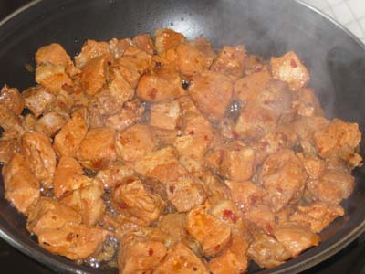 Через час шумовкой выложить мясо на сито, дать немного стечь бульону, выложить на сковороду с разогретым маслом и обжарить до легкой корочки.