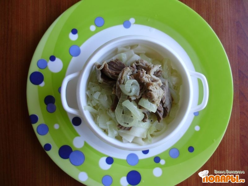 Собираем мясо. Вообще обычно берется большое блюдо, на него раскладывается жайма, вокруг жаймы картофель (его иногда варят в мясном бульоне), затем в самый центр жаймы выкладывается сверху мясо кусками, вокруг мяса выкладывается лук. Бульон подается отдельно. Можно в порционную глубокую тарелку просто все сложить аккуратно слоями и залить сверху бульоном.