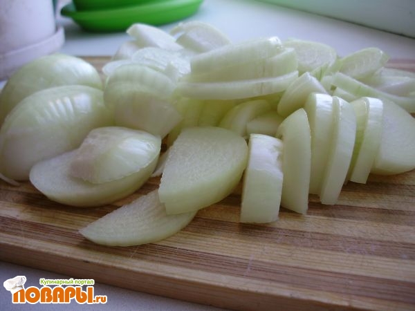 Готовим лук. Это самый шик. Лука нужно много. Наливаем в сотейник масло. Нарезаем лук нетонкими полукольцами, припускаем, "пропариваем" в сотейнике под крышкой. Солим и перчим. Солим в начале, чтобы лук сок дал и пропаривался в своем соку и в масле. Масла не жалеем, но и льем без фанатизма. Без лука теперь и мясо по-казахски не по-казахски!