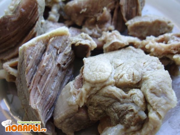 Ставим вариться кусок мяса. Варим часа 1,5. Первый бульон сливаем (доводим до кипения, варим немного и все кроме мяса отправляем в далекую экспедицию по трубам). Наливаем чисту водицу, солим, кладем лук, морковь и мясо, довариваем.