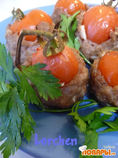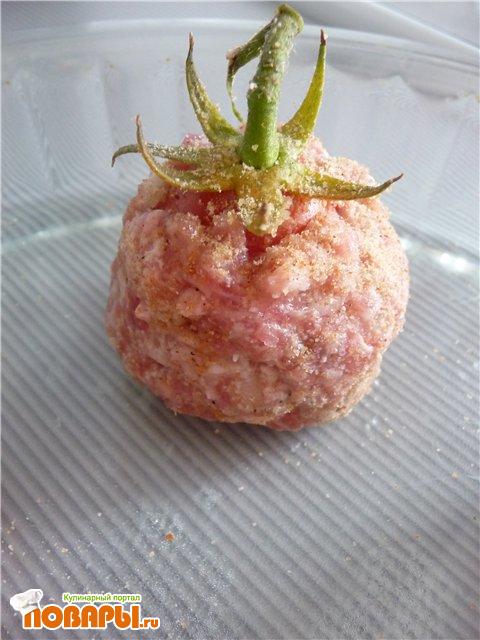 Из фарша делам на ладошке лепешку, ставим помидор, "обволакиваем" его фаршем.