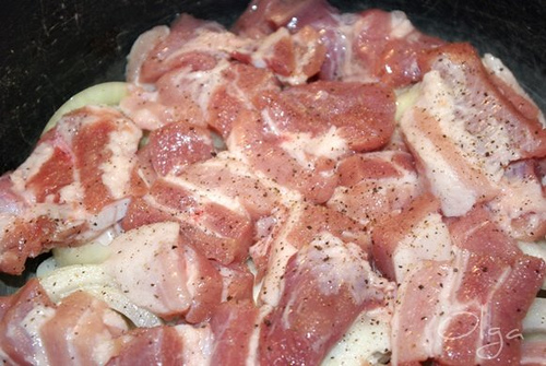 На дно кастрюли, рекомендуется казан, но его у меня нет, наливаем растительное масло, выкладываем внушительный слой лука кольцами, мясо средними кусочками, солим, перчим