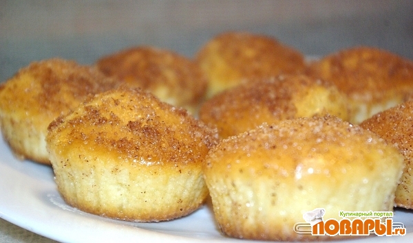 Масло растопить, сахар смешать с корицей. Обмакнуть кексики в масло и присыпать или обвалять в сахаре с корицей, как удобнее.