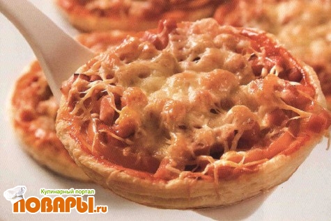 На каждую основу из теста выложите по несколько кружочков помидоров, затем - вечину и посыпьте тертым сыром. Запекайте пиццы 20 минут при 200 °С Подавайте пиццы горячими.