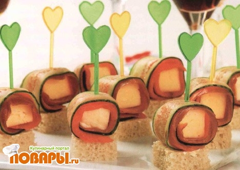 Оберните ими кубик сыра (огурцом наружу), проколите все это шпажкой, которую воткните затем в подготовленный кусочек хлеба.