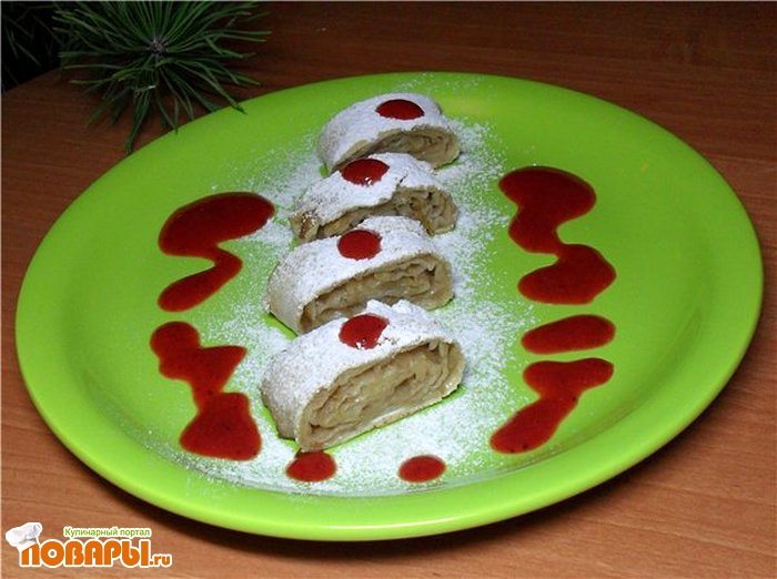Т.к. делала из остатков теста, то штрудель получился такой маленький, чем мне очень понравился, кусочек на два укуса. :) Теперь больше не буду делать большой штрудель, лучше несколько маленьких накрутить.