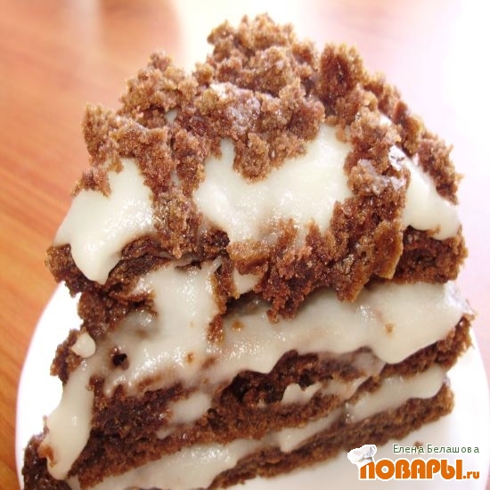 Корж делим на 3 «уголка», промазываем кремом каждый уголок, а сверху посыпаем остатками от коржей, крошками.
