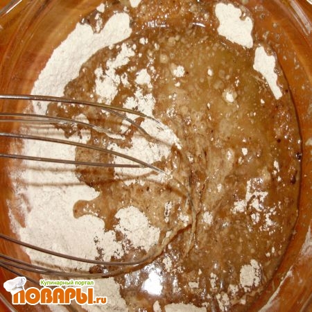 Можно потом все миксером перемешать или венчиком, а затем перелить в форму. Воды для теста понадобится чуть больше половины стакана, неполный стакан.