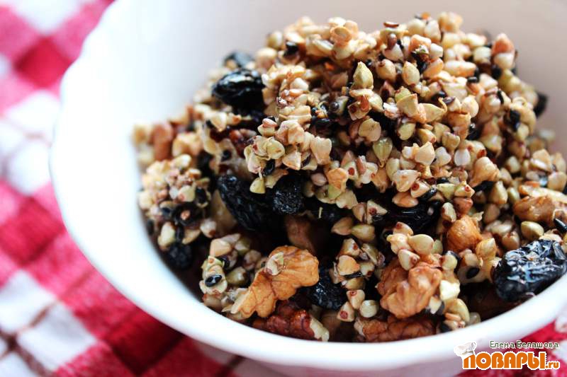 Проращиваем зеленую гречку (на самом деле, это пункт №1). Для этого заливаем ее водой на ночь, вода должна покрыть гречку, потом на другой день ее нужно промыть, оставить в сите и периодически увлажнять и перемешивать. Я просто сито под воду ставлю, перемешиваю, потом убираю на стол, как вспомню про гречку, повторяю процедуру. Гречка прорастает за сутки. Вечерком другого дня ее нужно тонким слоем рассыпать на тарелке, и за ночь она высохнет. Я делаю не на 3 порции обычно, а на 15-20. У меня сохнет гречка еще сутки.