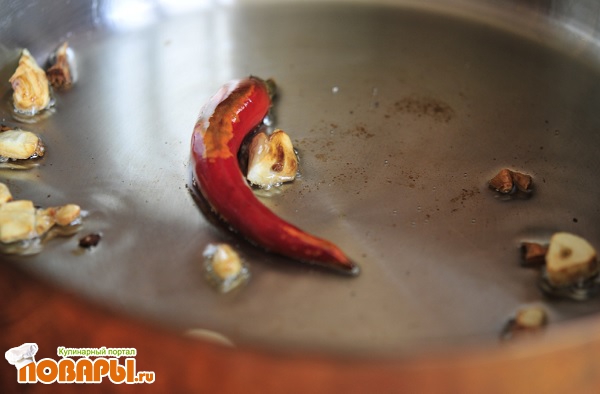 Разогреваем небольшое количество подсолнечного масла. Добавляем зубчики чеснока, порезанные на 2, так же цельный стручковый, красный перец. Таким образом держим все на небольшом огне, постоянно помешивая, в течение 5 минут, до того момента пока чеснок не станет поджаристым. После этого чеснок и перец изъять.