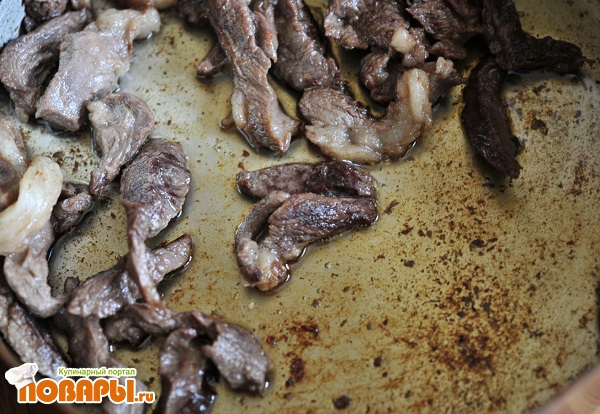 Добавляем на обжарку тонко и соломкой порезанную говядину или телятину. Убавляем огонь, закрываем крышкой и держим в течение 30 минут, периодически помешивая.