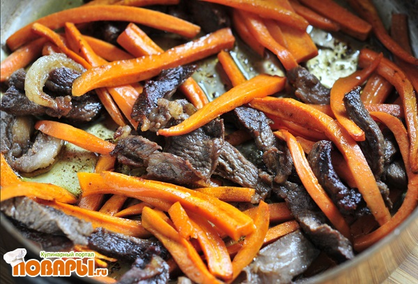 Как только говядина размягчится и немного возьмётся корочкой можно добавлять морковь, порезанную соломкой. Тушить все так же под закрытой крышкой в течение 10 минут. Затем можно немного прибавить огонь, чтобы у моркови появилась корочка.