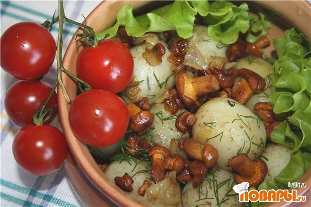 Картофель отварить, слить воду, вернуть на огонь и на самом маленьком огне обсушить. Затем разложить по тарелкам. Укроп помыть, мелко порезать и выложить на картофель. Ну а сверху жаренные лисички.