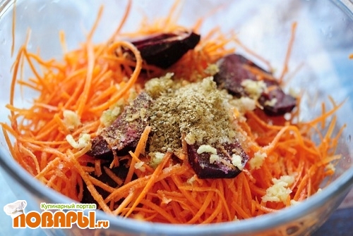 Теперь когда все ингредиенты готовы можно приступать к магии, т. е. к основному приготовлению морковки. Сложили все выше указанные ингредиенты в отдельную посудинку, далее добавим чуть больше столовой ложки сахара и по вкусу соль, ну приблизительно пол чайной ложки. И мнем ручками нашу морковку, мнем… мнем.. оставляем на 5-7 минут чтобы свекла немного дала сок и опять мнем.