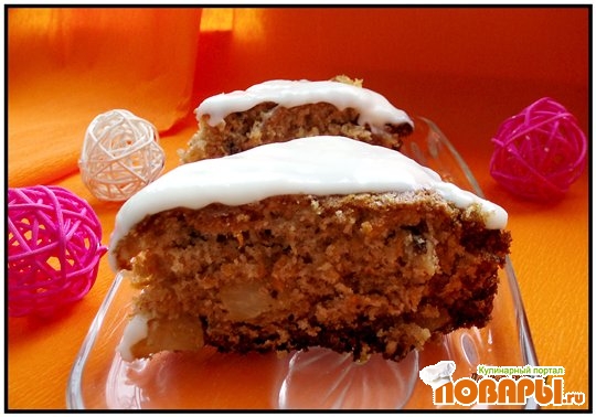 Очень вкусный, ароматный пирожок. Пушистый, с еле уловимым ароматом кокоса, с кусочками грецких орехов и ананасов. Морковь придает цвет и в пироге совсем не чувствуется. Соли я положила гораздо меньше. Выпекалось не час, а где-то минут 35-40. Пирог получается очень большой. У меня была форма диаметром 26см. А глазурь какая приятная! С небольшой кислинкой, не приторная, мягкая……