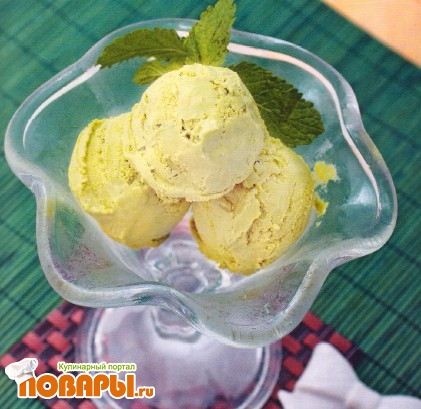 Готовое мороженое выложить в креманки или вазочки, желательно с помощью специальной ложки, делающей шарики.