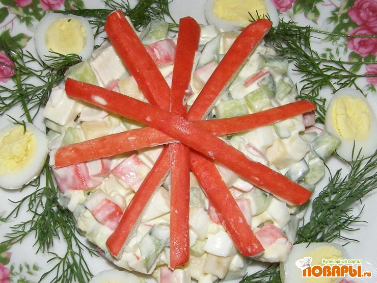 Продукты для салата порезать, смешать и заправить сметаной пополам с майонезом.