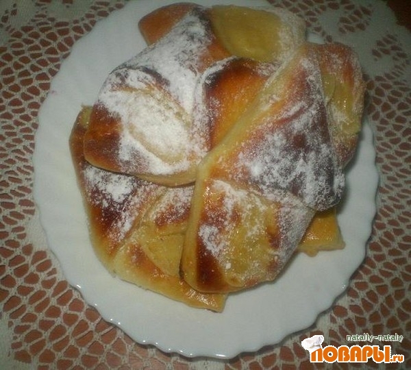 Внутрь каждого квадратика по диагонали положить по 1 чайной ложки крема и скрепить два края , накладывая один на другой в форме конвертика.Выложить булочки на противень и поставить в предварительно разогретую духовку до 200 градусов на нижнюю полку на 10 минут.
