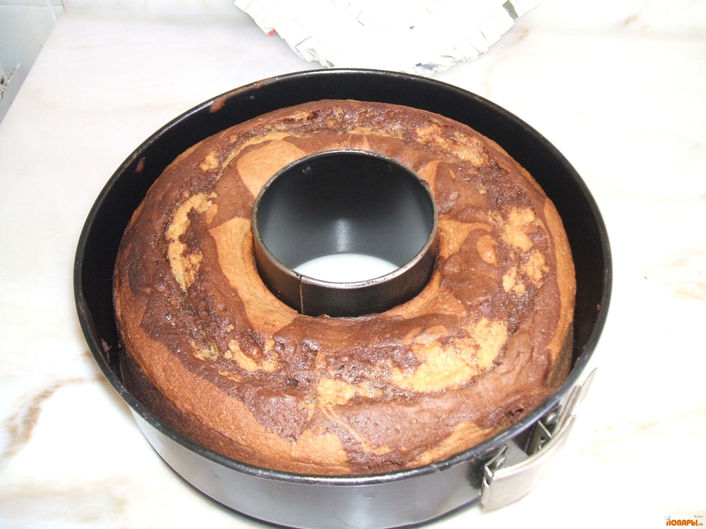 Не перемешивать ложкой, иначе узор не получится! Выпекать в предварительно нагретой духовке около 40-50 минут. Проверить деревянной шпажкой на готовность. Получается очень вкусный и нежный бисквит с замысловатым рисунком по всему коржу. Приятного аппетита!