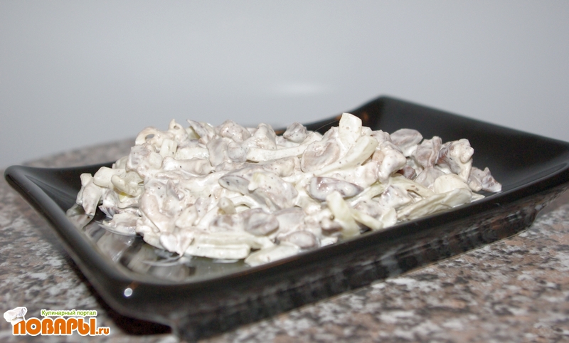 Лук, сердечки смешиваем. Перчим, немного солим. Добавляем сметану и майонез.