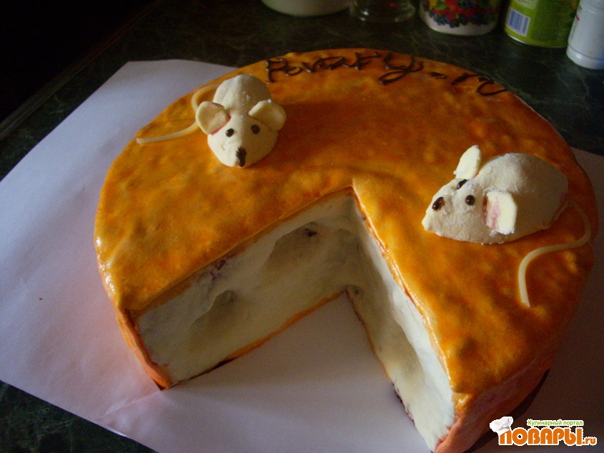 Взбиваем сметану с сахаром. Измельчаем клюкву. Смазываем коржи то сливками, то клюквой по очереди. Вырезаем из торта сектор, выковыриваем имитацию сырных дырочек :) и покрываем мастикой. Рецепт мастики брала из темки с этого форума, поэтому писать подробно не буду :) Мышки из мастики.