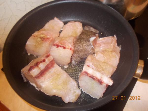 Обжарить кусочки рыбы на растительном масле с обоих сторон, предварительно посолить, поперчить, приправить специями по вкусу.