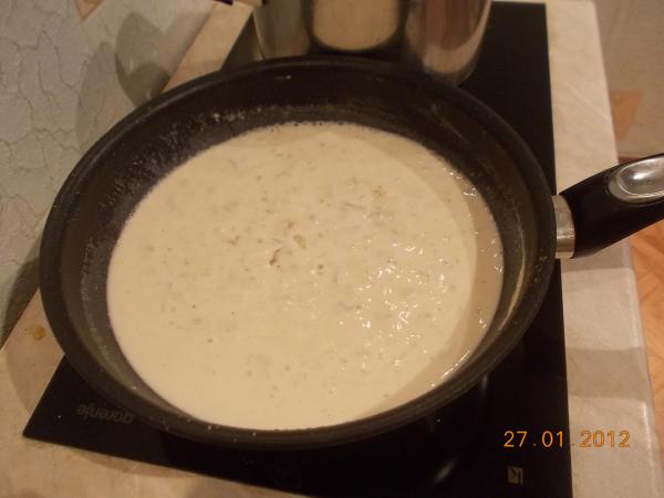 Залейте обжаренный лук сметаной и дайте закипеть, посолите, поперчите по вкусу.