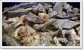 Когда лук приобрел золотистый цвет можно добавлять печень. Печень я обычно режу крупно, чтобы полностью насладиться её вкусом.