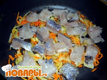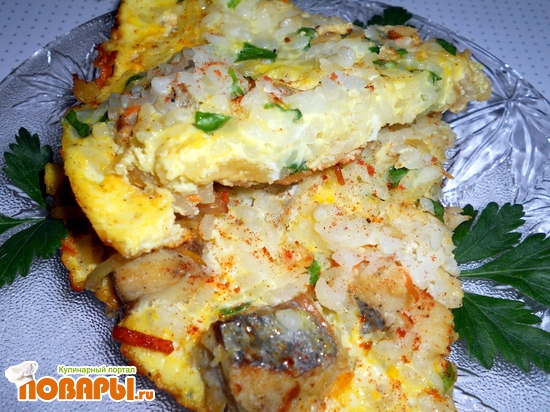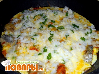 К яйцам добавить молоко, рис, куркуму, зелень, специи и перемешать. Морковь натереть и обжарить немного с луком. Сверху выложить рыбку и чуть протушить.