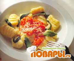 В это время налить в кастрюлю 2 л подсоленной воды, довести до кипения. Ньокки осторожно положить в кипящую воду и варить около 4 мин. Готовые ньокки достать шумовкой, положить в сковороду с соусом, перемешать и подавать горячими.