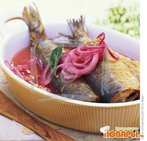 Рыбу вынуть из сковороды, добавить оливкового масла и выложить в сковороду овощи и специи. Потушить до золотистого цвета (время - 2 мин.). Добавить оставшееся масло, уксус и воду.