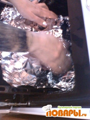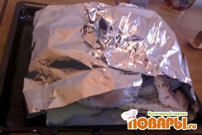 Зашивать не надо! Просто заворачиваем в фольгу предварительно смазав маслом и ставим в духовку на средний огонь.