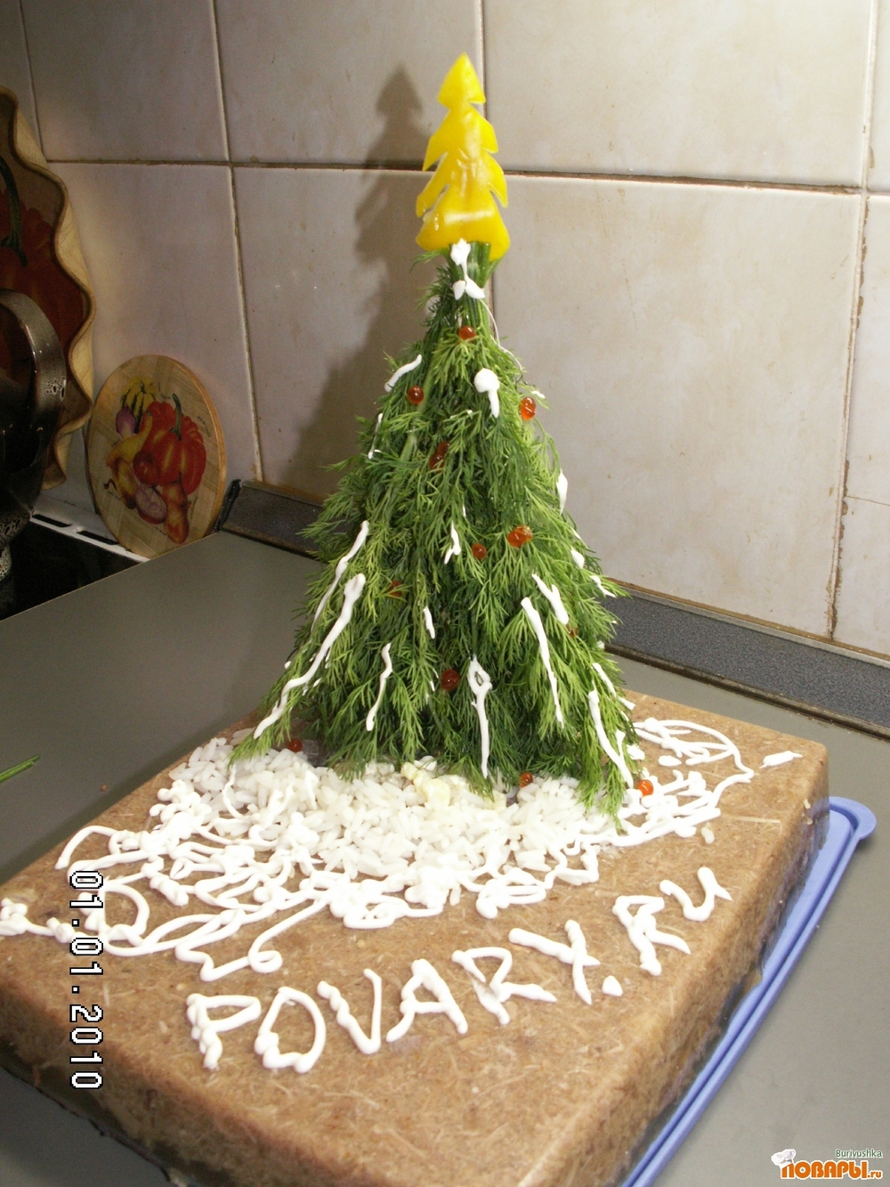 Это блюдо у нас считается строго новогодним, потому что делается только раз в году. На главной фотке украшение из укропа, нанизанного на шпажку, а для стола я несколько изменила украшение. В целях экономии места (холодец занимает значительную часть стола) я выложила на него горкой плотные салаты (оливье и крабовый) и замаскировала их под елочки. Елочки получились более толстенькие, зато эффект от компановки превзошел все ожидания! На фотке только один салат, вторая елочка была поставлена на надпись "повары.ру"))), больше места не нашлось.