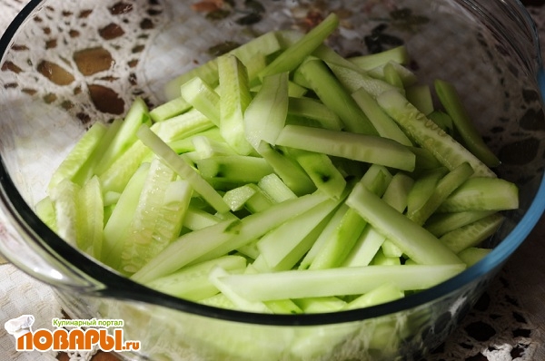 Подготовленные огурчики нужно порезать соломкой шириной 1см. и длиной приблизительно 5 см. Порезали, значит выполнили самую трудную работу.