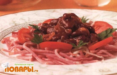 Окорок или ветчину нашинкуйте соломкой или нарежьте тонкими ломтиками, уложите вокруг фасоли.