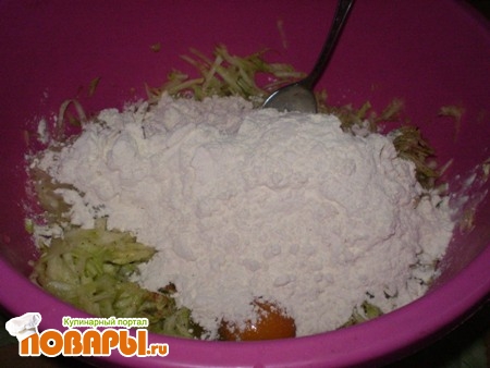 Добавить муки и замесить тесто. Тесто должно быть не густым, но если сильно жидкое, так как кабачки пускают сок, то можно еще муки чуть больше добавить, или же просто слить сок с кабачков.