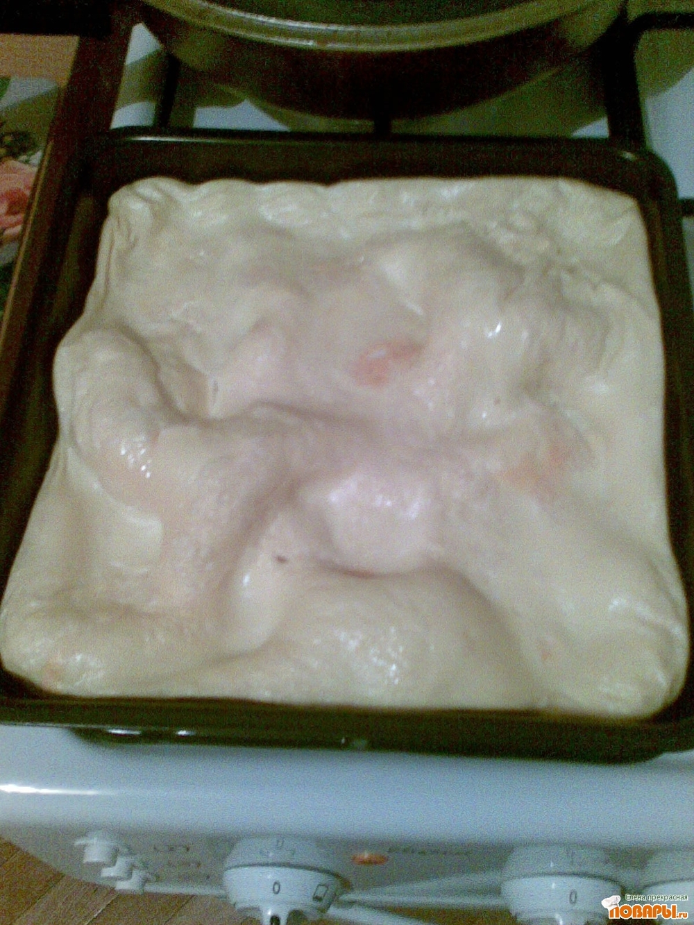 Сверху вылить вторую половину яйцовой смеси-предварительно хорошо взбив. Поставить выпекаться в духовку до полной готовности.Готовность проверить шпажкой.