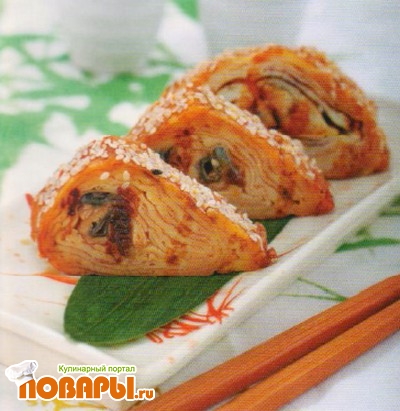 Сверху выложить рулет с угрём. Жарить около 1,5 минут.