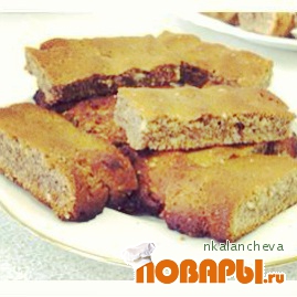Полученную массу выложите на смазанный маслом противень и выпекайте 20 минут при 180° С, охладите. Выпеченный корж нарежьте в форме батончиков. При подаче уложите батончики на блюдо и посыпьте орехами.