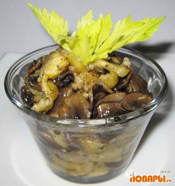 Шляпки шампиньонов очистить от верхней кожицы, нарезать пластинками и обжарить в разогретом масле на большом огне, в конце посолить. Остудить. 2 ст.л. масла смешать с уксусом и пропущенным через пресс чесноком.