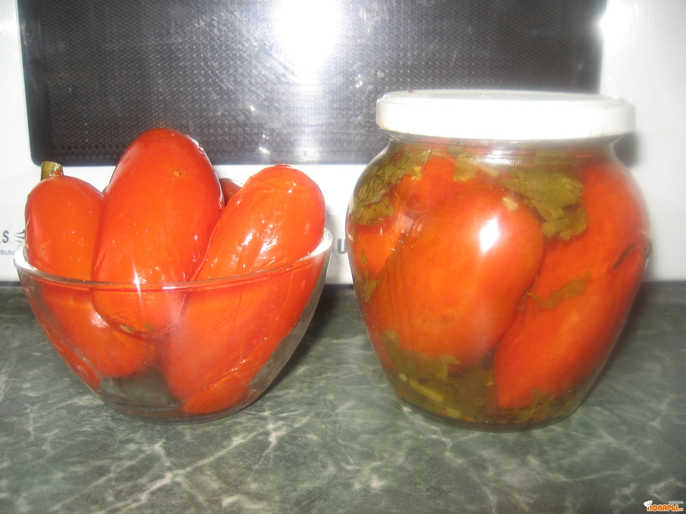 На дно банки укладываем пряности, помидоры, заливаем горячей заливкой, вливаем уксусную эссенцию. Накрываем банки крышками и стерелизуем 10-15 минут, в кипящей воде.