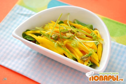 В тарелку выложить листья салата, сверху оба манго, перья зеленого лука, посыпать фисташками и полить соусом.